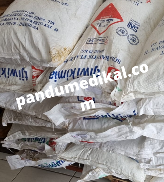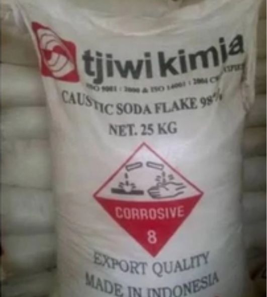 Caustic soda flake 98% - kemasan 25 kg / zak Ex. Tjiwi Kimia Bentuk : Flake, warna putih Sifat : Korosif, Higroskopis (mudah menyerap air) Grade : Technical Grade/grade teknis
